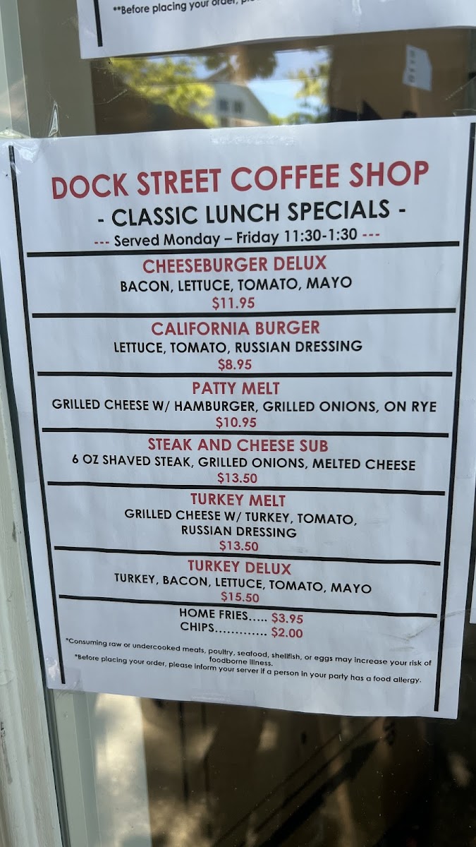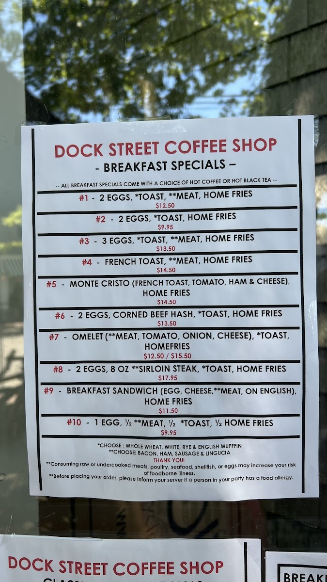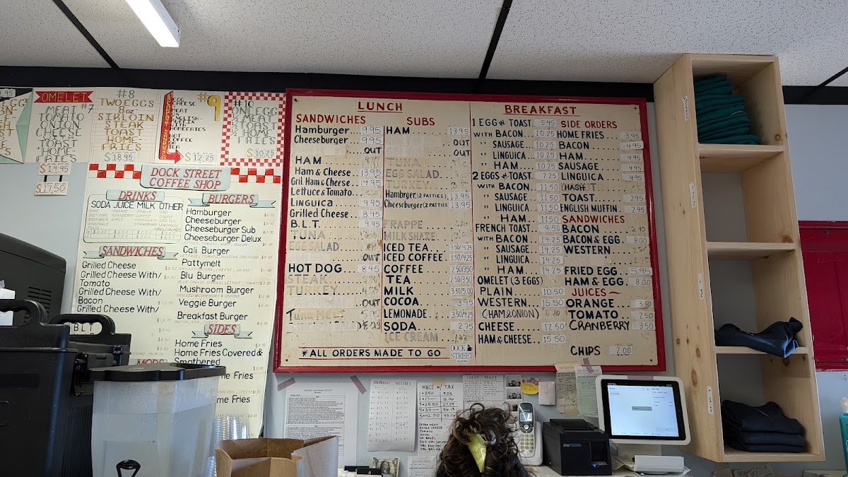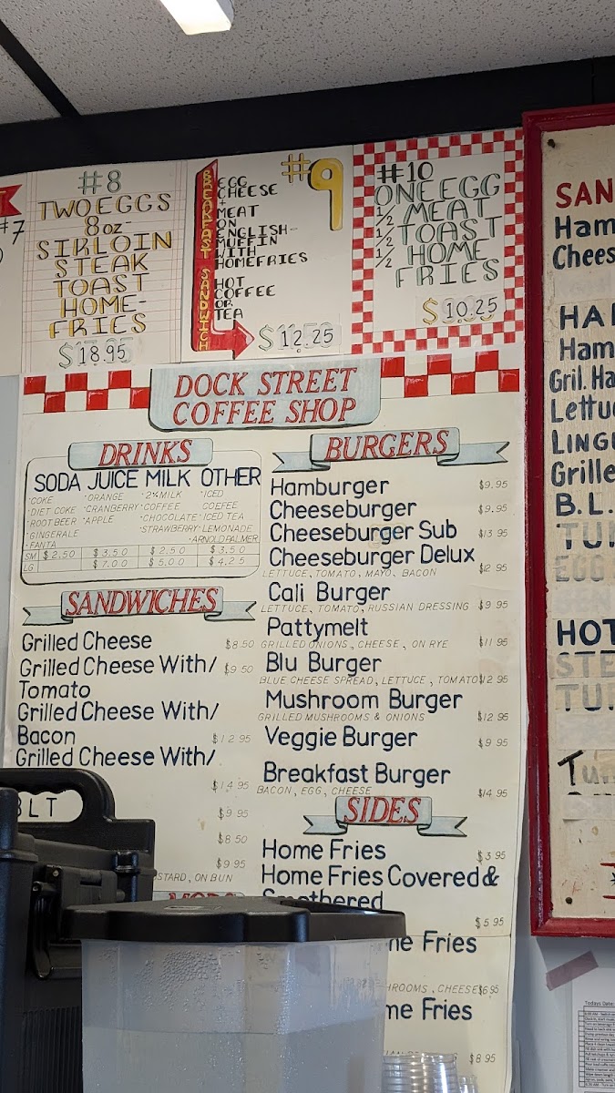 Dock Street Coffee Shop offers a straightforward and comforting menu that fits perfectly with its relaxed, classic diner vibe. Whether you’re stopping by for a morning bite or a midday meal, you’ll find simple, well-prepared options that feel familiar and satisfying.