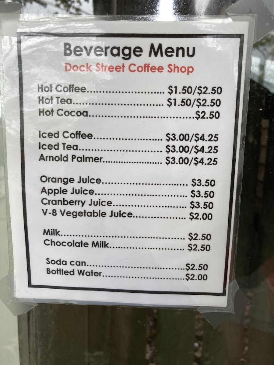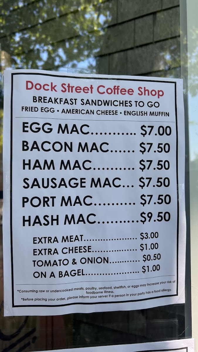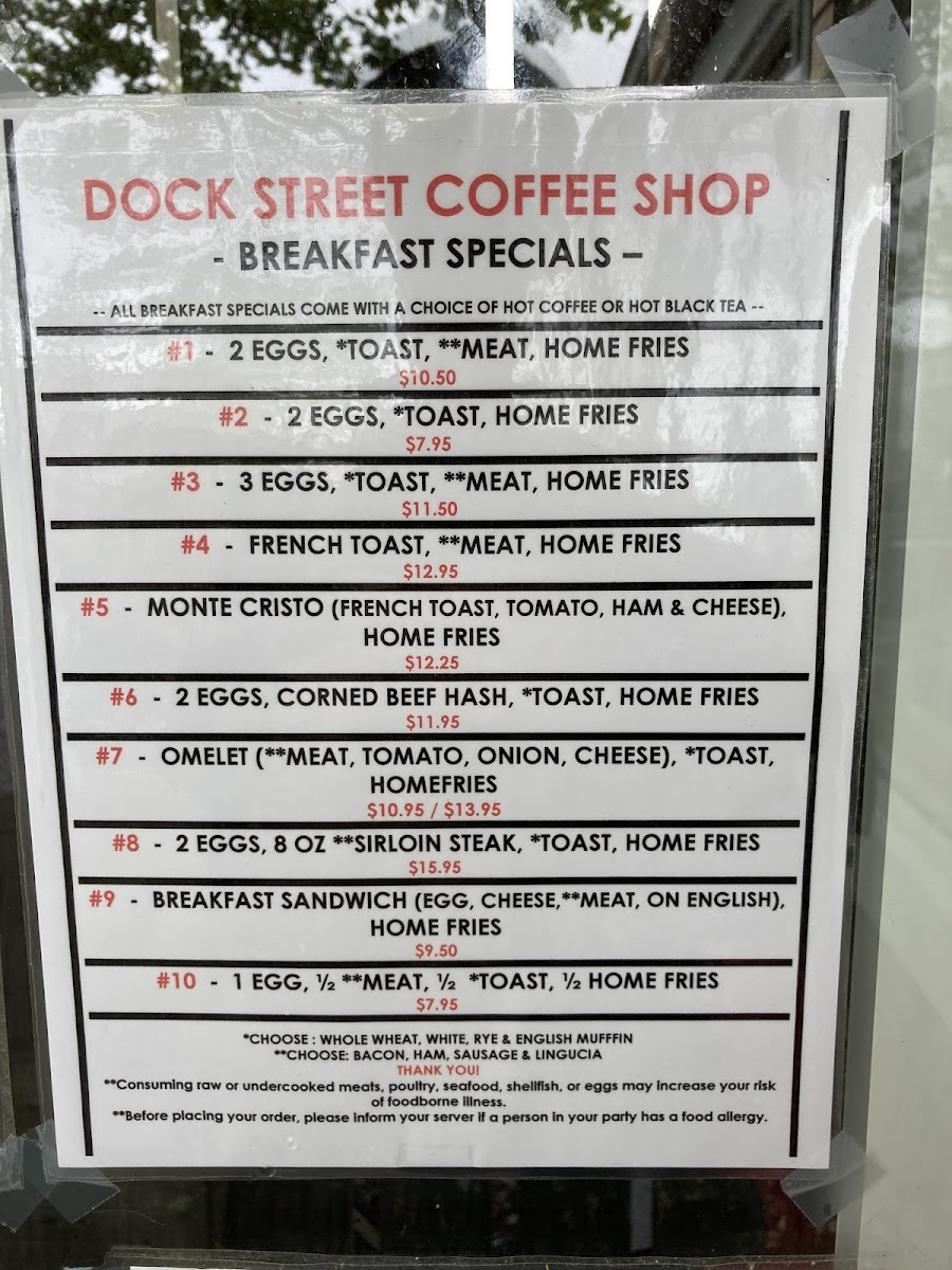 Dock Street Coffee Shop offers a straightforward and comforting menu that fits perfectly with its relaxed, classic diner vibe. Whether you’re stopping by for a morning bite or a midday meal, you’ll find simple, well-prepared options that feel familiar and satisfying.